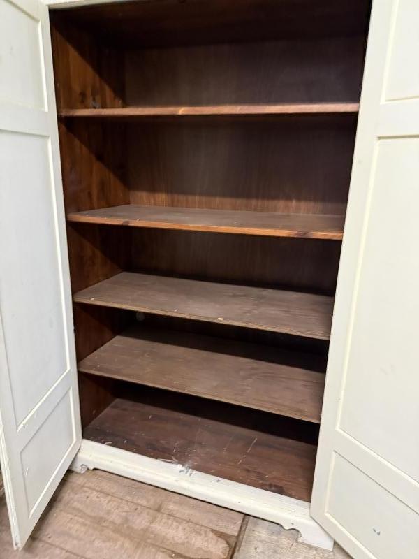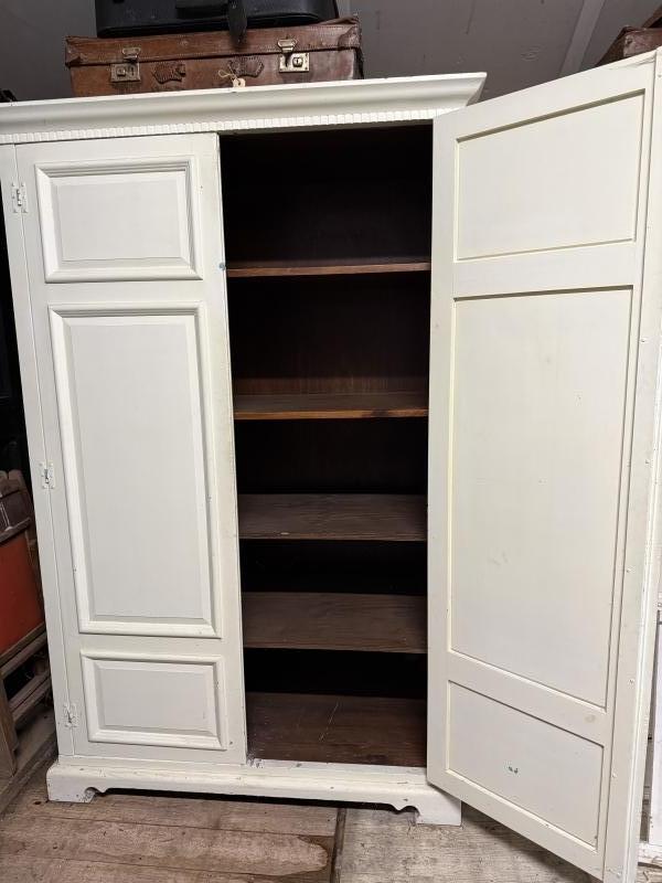 Charmante brocante linnenkast met twee deuren. Ideaal voor het opbergen van kleding, linnengoed of andere spullen. De kast heeft een mooie uitstraling en past goed in een landelijk, brocant of vintage interieur. Binnenin bevinden zich planken.