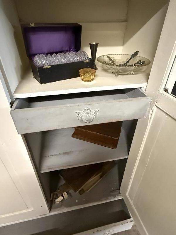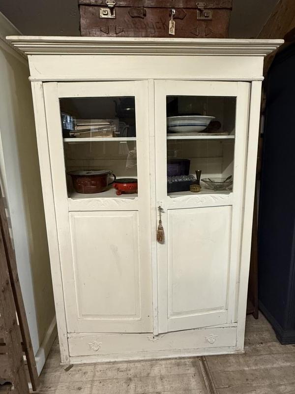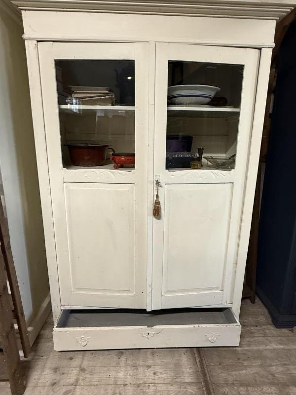 Charmante vintage vitrinekast in brocante stijl. Deze kast is perfect voor het tentoonstellen van uw favoriete items. De kast heeft een unieke uitstraling en voegt een vleugje nostalgie toe aan elk interieur. Ideaal voor de liefhebber van vintage en brocante meubels. Met glazen deuren en planken.